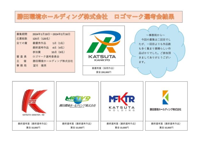 応募期間が令和6年1月19日~令和6年2月16日となっていました2回目の勝田環境ホールディング(株)のロゴマーク募集について多数の方にご応募頂き誠にありがとうございました。