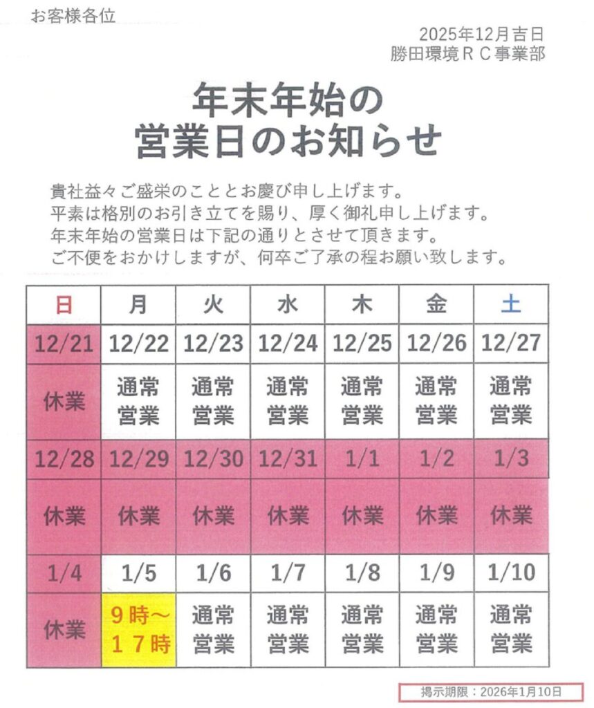 お知らせ年末年始の営業日のお知らせ 年末年始の営業日のお知らせ news 2025年12月19日 年末年始の営業日は下記の通りとさせて頂きます。ご不便をおかけしますが、何卒ご了承の程お願い致します。 関連記事 干し芋残渣を堆肥化しています。 お知らせ 2025年11月4日 第二土曜日午後営業のお知らせ お知らせ 2024年10月10日 勝田環境ホールディングのロゴマーク選考結果(2回目)のお知らせ お知らせ 2024年3月7日 搬入予約の電話は必要なくなりました。<蛍光灯の受け入れ開始のご案内> お知らせ 2023年12月1日 おすすめの記事 干し芋残渣を堆肥化しています。 第二土曜日午後営業のお知らせ 勝田環境ホールディングのロゴマーク選考結果(2回目)のお知らせ 搬入予約の電話は必要なくなりました。<蛍光灯の受け入れ開始のご案内> 茨城県障害者雇用優良企業の認定を受けました。 もっとロードする