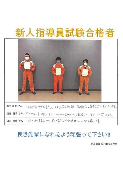 イベントニュース新人指導員! 新人指導員! 2020年9月19日 2020年9月19日(土)に新入社員を指導する新人指導員試験の合格発表が行われ、試験者全員(3名)が合格しました。新人指導員には今後1年間、新人指導員手当として毎月3,000円が支給されます。 関連記事 磯崎自治会主催 「心と体の健康増進Fes.」 イベントニュース 2025年10月5日 新人指導員 イベントニュース 2025年9月22日 スカニア(外車トラック)購入について イベントニュース 2025年8月20日 BBQ イベントニュース 2025年8月8日 おすすめの記事 磯崎自治会主催 「心と体の健康増進Fes.」 新人指導員 スカニア(外車トラック)購入について BBQ 還暦(定年)祝い もっとロードする