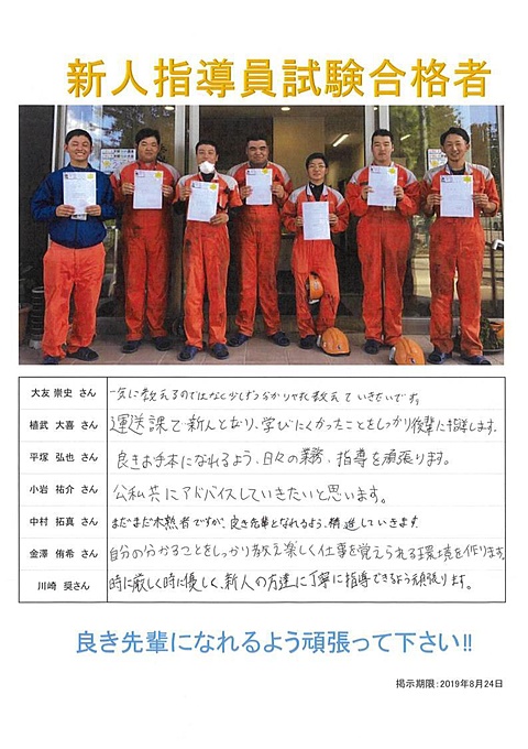 イベントニュース新人指導員! 新人指導員! 2019年8月5日 2019年8月5日(月)に新入社員を指導する新人指導員試験の合格発表が行われ、試験者全員(7名)が合格しました。新人指導員には今後1年間、新人指導員手当として毎月3,000円が支給されます。 関連記事 磯崎自治会主催 「心と体の健康増進Fes.」 イベントニュース 2025年10月5日 新人指導員 イベントニュース 2025年9月22日 スカニア(外車トラック)購入について イベントニュース 2025年8月20日 BBQ イベントニュース 2025年8月8日 おすすめの記事 磯崎自治会主催 「心と体の健康増進Fes.」 新人指導員 スカニア(外車トラック)購入について BBQ 還暦(定年)祝い もっとロードする