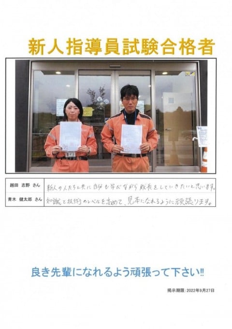 2022年9月21日(水)に新入社員を指導する新人指導員試験の合格発表が行われ、試験者全員(2名)が合格しました。新人指導員には今後1年間、新人指導員手当として毎月3,000円が支給されます。