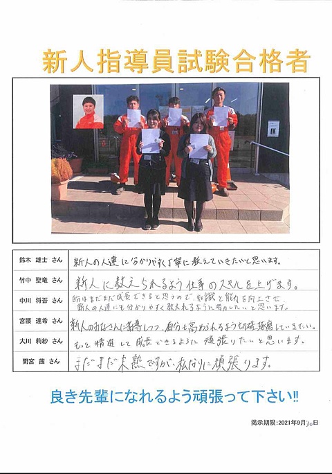 イベントニュース新人指導員 新人指導員 2021年9月21日 2021年9月21日(火)に新入社員を指導する新人指導員試験の合格発表が行われ、試験者全員(6名)が合格しました。新人指導員には今後1年間、新人指導員手当として毎月3,000円が支給されます。 関連記事 磯崎自治会主催 「心と体の健康増進Fes.」 イベントニュース 2025年10月5日 新人指導員 イベントニュース 2025年9月22日 スカニア(外車トラック)購入について イベントニュース 2025年8月20日 BBQ イベントニュース 2025年8月8日 おすすめの記事 磯崎自治会主催 「心と体の健康増進Fes.」 新人指導員 スカニア(外車トラック)購入について BBQ 還暦(定年)祝い もっとロードする