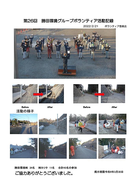 2022年2月21日(月)の早朝に勝田環境の社員34名、グループ会社の社員11名、合計45名で勝田環境RC事業所周辺の道路と高野墓地の清掃を行いました。