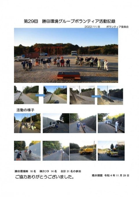 イベントニュース第29回勝田環境グループボランティア清掃 第29回勝田環境グループボランティア清掃 2022年11月8日 2022年11月8日(火)の早朝に勝田環境の社員18名、グループ会社の社員14名、合計32名で勝田環境RC事業所周辺の道路と高野墓地の清掃を行いました。 関連記事 磯崎自治会主催 「心と体の健康増進Fes.」 イベントニュース 2025年10月5日 新人指導員 イベントニュース 2025年9月22日 スカニア(外車トラック)購入について イベントニュース 2025年8月20日 BBQ イベントニュース 2025年8月8日 おすすめの記事 磯崎自治会主催 「心と体の健康増進Fes.」 新人指導員 スカニア(外車トラック)購入について BBQ 還暦(定年)祝い もっとロードする