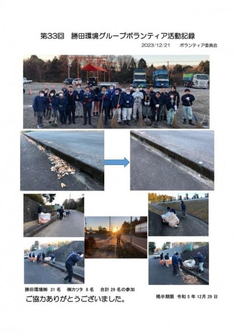 イベントニュース第33回勝田環境グループボランティア清掃 第33回勝田環境グループボランティア清掃 2023年12月21日 2023年12月21日(木)の早朝に勝田環境の社員21名、グループ会社の社員8名、合計29名で勝田環境RC事業所周辺の道路と高野墓地の清掃を行いました。 関連記事 磯崎自治会主催 「心と体の健康増進Fes.」 イベントニュース 2025年10月5日 新人指導員 イベントニュース 2025年9月22日 スカニア(外車トラック)購入について イベントニュース 2025年8月20日 BBQ イベントニュース 2025年8月8日 おすすめの記事 磯崎自治会主催 「心と体の健康増進Fes.」 新人指導員 スカニア(外車トラック)購入について BBQ 還暦(定年)祝い もっとロードする