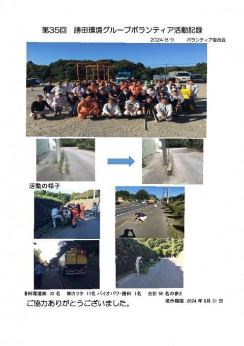 イベントニュース第35回勝田環境グループボランティア清掃 第35回勝田環境グループボランティア清掃 eventtop 2024年8月9日 2024年8月9日(金)の早朝に勝田環境の社員32名、グループ会社の社員18名、合計50名で勝田環境RC事業所周辺の道路と高野墓地の清掃を行いました。 関連記事 磯崎自治会主催 「心と体の健康増進Fes.」 イベントニュース 2025年10月5日 新人指導員 イベントニュース 2025年9月22日 スカニア(外車トラック)購入について イベントニュース 2025年8月20日 BBQ イベントニュース 2025年8月8日 おすすめの記事 磯崎自治会主催 「心と体の健康増進Fes.」 新人指導員 スカニア(外車トラック)購入について BBQ 還暦(定年)祝い もっとロードする