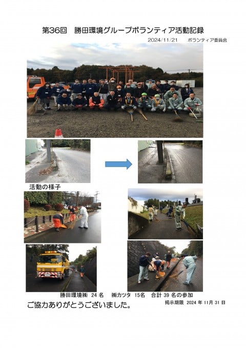 イベントニュース第36回勝田環境グループボランティア清掃 第36回勝田環境グループボランティア清掃 event 2024年11月21日 2024年11月21日(木)の早朝に勝田環境の社員24名、グループ会社の社員15名、合計39名で勝田環境RC事業所周辺の道路と高野墓地の清掃を行いました。 関連記事 磯崎自治会主催 「心と体の健康増進Fes.」 イベントニュース 2025年10月5日 新人指導員 イベントニュース 2025年9月22日 スカニア(外車トラック)購入について イベントニュース 2025年8月20日 BBQ イベントニュース 2025年8月8日 おすすめの記事 磯崎自治会主催 「心と体の健康増進Fes.」 新人指導員 スカニア(外車トラック)購入について BBQ 還暦(定年)祝い もっとロードする