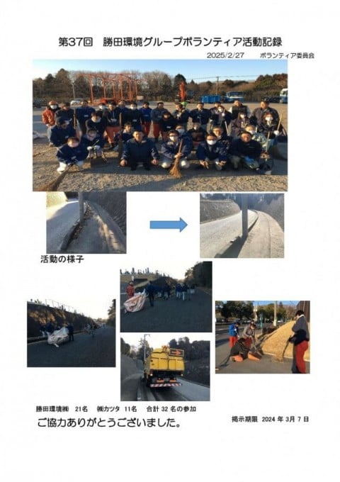 イベントニュース第37回勝田環境グループボランティア清掃 第37回勝田環境グループボランティア清掃 event 2025年2月27日 2025年02月27日(木)の早朝に勝田環境の社員21名、グループ会社の社員11名、合計32名で勝田環境RC事業所周辺の道路と高野墓地の清掃を行いました。 関連記事 磯崎自治会主催 「心と体の健康増進Fes.」 イベントニュース 2025年10月5日 新人指導員 イベントニュース 2025年9月22日 スカニア(外車トラック)購入について イベントニュース 2025年8月20日 BBQ イベントニュース 2025年8月8日 おすすめの記事 磯崎自治会主催 「心と体の健康増進Fes.」 新人指導員 スカニア(外車トラック)購入について BBQ 還暦(定年)祝い もっとロードする