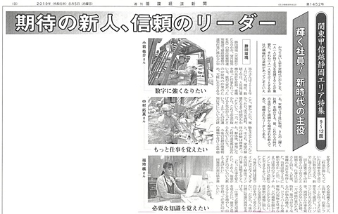 2019年8月5日の週刊循環経済新聞にて期待の新人として勝田環境(株)の3名の社員が紹介されました。