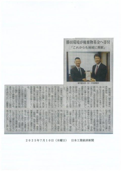 掲載メディア2025.07.10 日本工業新聞 2025.07.10 日本工業新聞 top 2025年7月10日 2025年7月10日の日本工業新聞にて勝田環境の県有害廃棄物等撤去基金に寄付を行った記事が掲載されました。 関連記事 2025.07.05 茨城新聞 掲載メディア 2025年7月5日 2024.06.04 茨城新聞 掲載メディア 2024年6月4日 2023.06.25 ひたちなか市市報 掲載メディア 2023年6月25日 2021.11.08 週刊循環経済新聞 掲載メディア 2021年11月8日 おすすめの記事 2025.07.05 茨城新聞 2024.06.04 茨城新聞 2023.06.25 ひたちなか市市報 2021.11.08 週刊循環経済新聞 2021.06.01 常陽産研NEWS もっとロードする