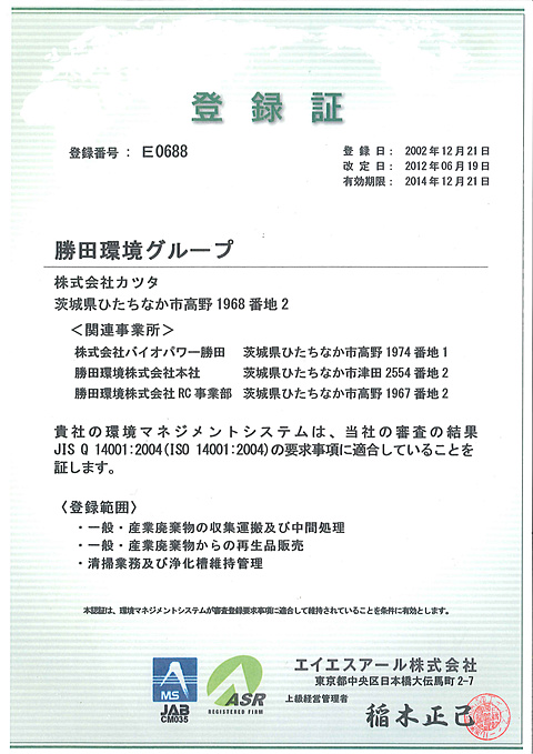 イベントニュースISO14001再認証 ISO14001再認証 2012年6月12日 勝田環境株式会社、株式会社カツタ、株式会社バイオパワー勝田3社を統合化し、ISO14001の再認証を受けました。 関連記事 磯崎自治会主催 「心と体の健康増進Fes.」 イベントニュース 2025年10月5日 新人指導員 イベントニュース 2025年9月22日 スカニア(外車トラック)購入について イベントニュース 2025年8月20日 BBQ イベントニュース 2025年8月8日 おすすめの記事 磯崎自治会主催 「心と体の健康増進Fes.」 新人指導員 スカニア(外車トラック)購入について BBQ 還暦(定年)祝い もっとロードする